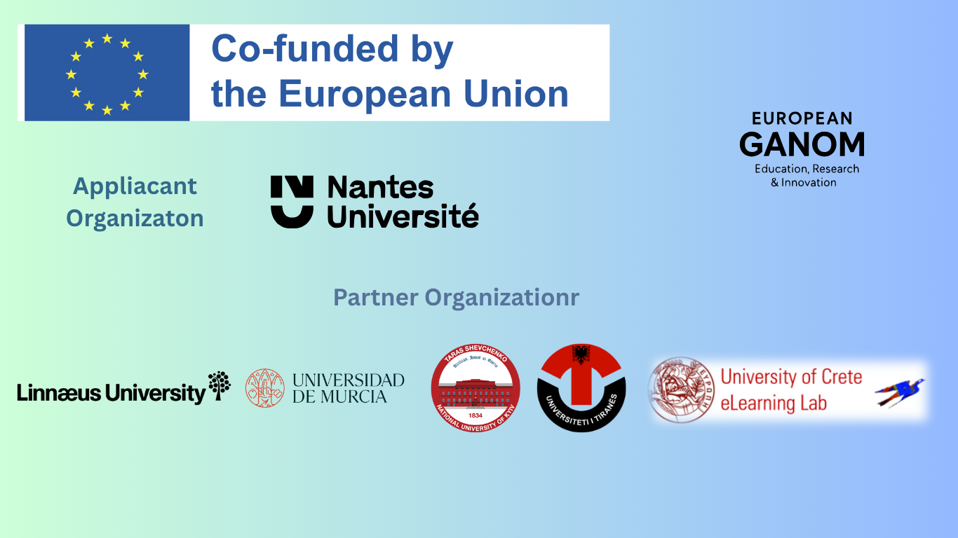 The EUGANOM project is implemented through a strategic partnership of European universities, coordinated by Nantes Université (France). Partner institutions from Sweden, Spain, Ukraine, Albania, and Greece collaborate to promote academic innovation and cross-border cooperation in higher education.